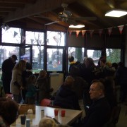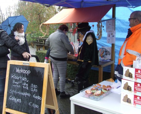 Beetje jammer voor Sinterklaas en zijn Pieten maar uit voorzorg en ook omdat het paviljoen voor zoveel kindjes te klein is, was er een prachtig grote tent geplaatst zodat Sinterklaas met zijn gevolg en alle kinderen met hun ouders, lekker droog konden genieten van dit hoog geplaatste bezoek. Liedjes werden gezongen en foto’s gemaakt van kindjes bij Sinterklaas op schoot.